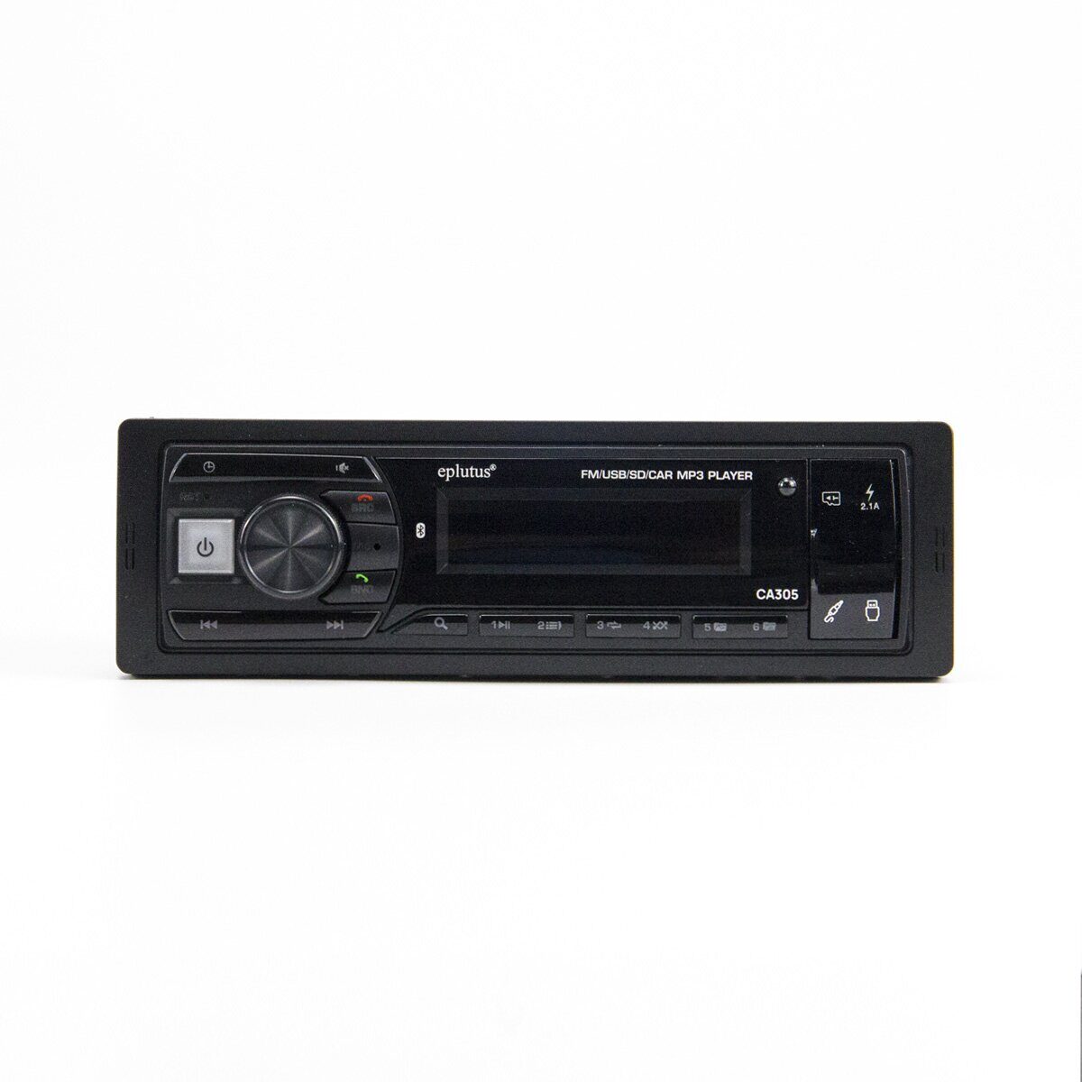 Магнитола оборудована наглядным жидкокристаллическим дисплеем, антенным входом, портами USB и AUX, что позволяет применять ее для гарантированно качественного прослушивания радипередач FM диапазона, а также воспроизведения аудиофайлов с флеш-карт, смартфонов и других компьютеризированных внешних гаджетов. Для сопряжения со сторонними устройствами Eplutus CA305 использует беспроводную связь Bluetooth версии 5.0.